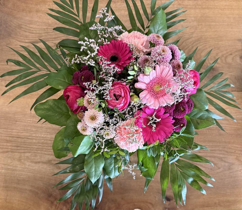 Traditionel buket, bundet i lyserøde, pink og lilla nuancer.