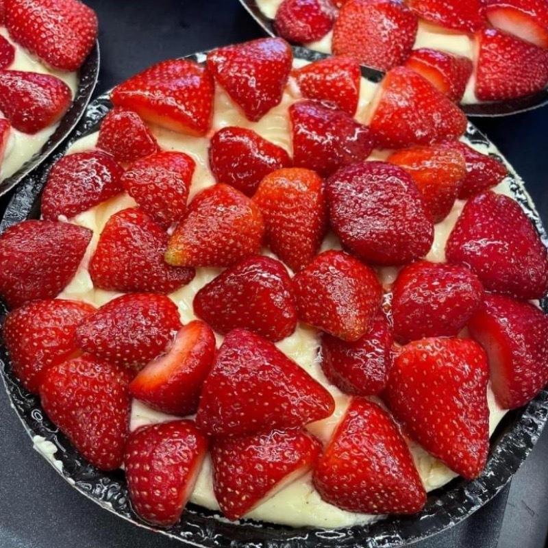 Hjemmelavet jordbærtærte på bund af marzarin & creme - toppet med revet hvid chokolad