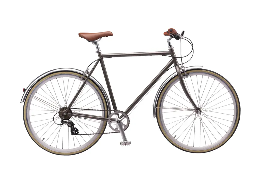 Det enkle, slanke stel, de tynde dæk med hvid kant samt sadel og greb i læderlook gør cyklen til et let, elegant og nostalgisk indslag på cykelstien.